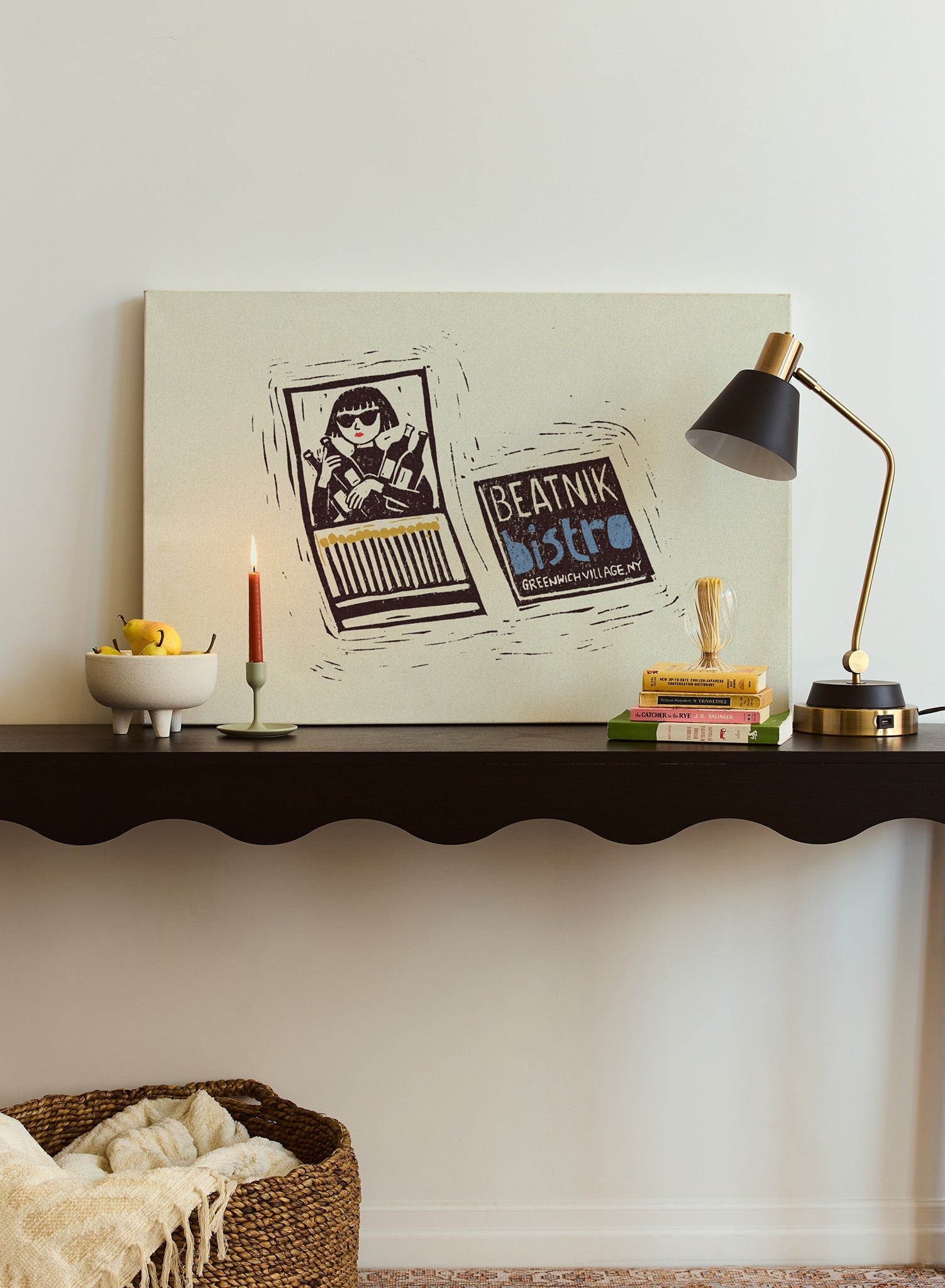 This piece was created by Valerie Perreault, a poet and printmaker whose work is rich with story and soul. She considers ‘Beatnik Bistro’ a personal favorite, noting its nod to poetry, a past haircut of her own, and classic red lipstick. Valerie carves each design by hand, embracing the meditative process and the imperfections that make each print unique.