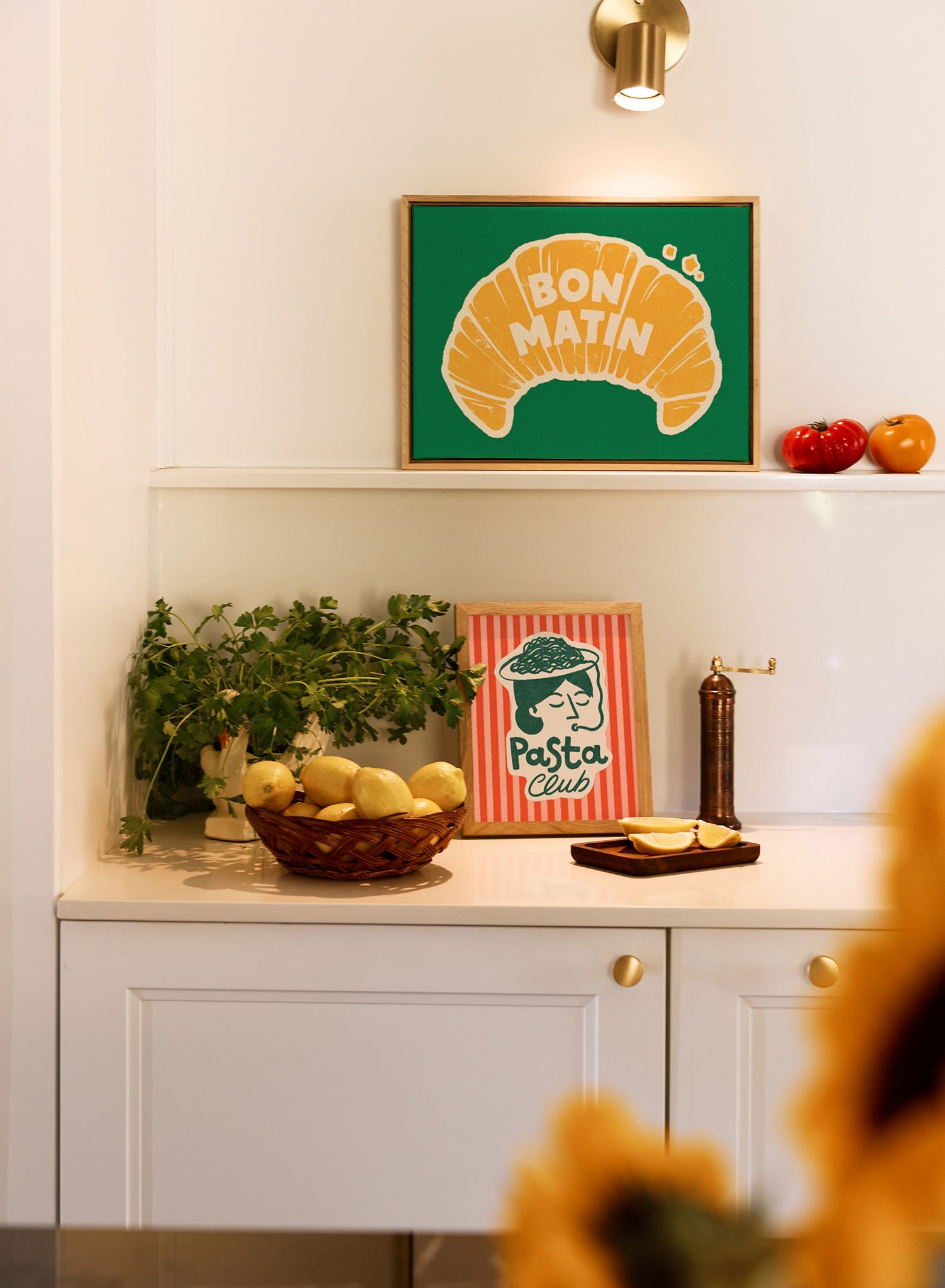 Wish your walls a 'Bon Matin' with this cheerful art print featuring a golden-yellow croissant. The friendly French greeting for 'good morning' is integrated into the illustration of the flaky pastry, which pops against a vibrant, deep green background. A subtle, distressed texture gives the piece a rustic, hand-printed feel.