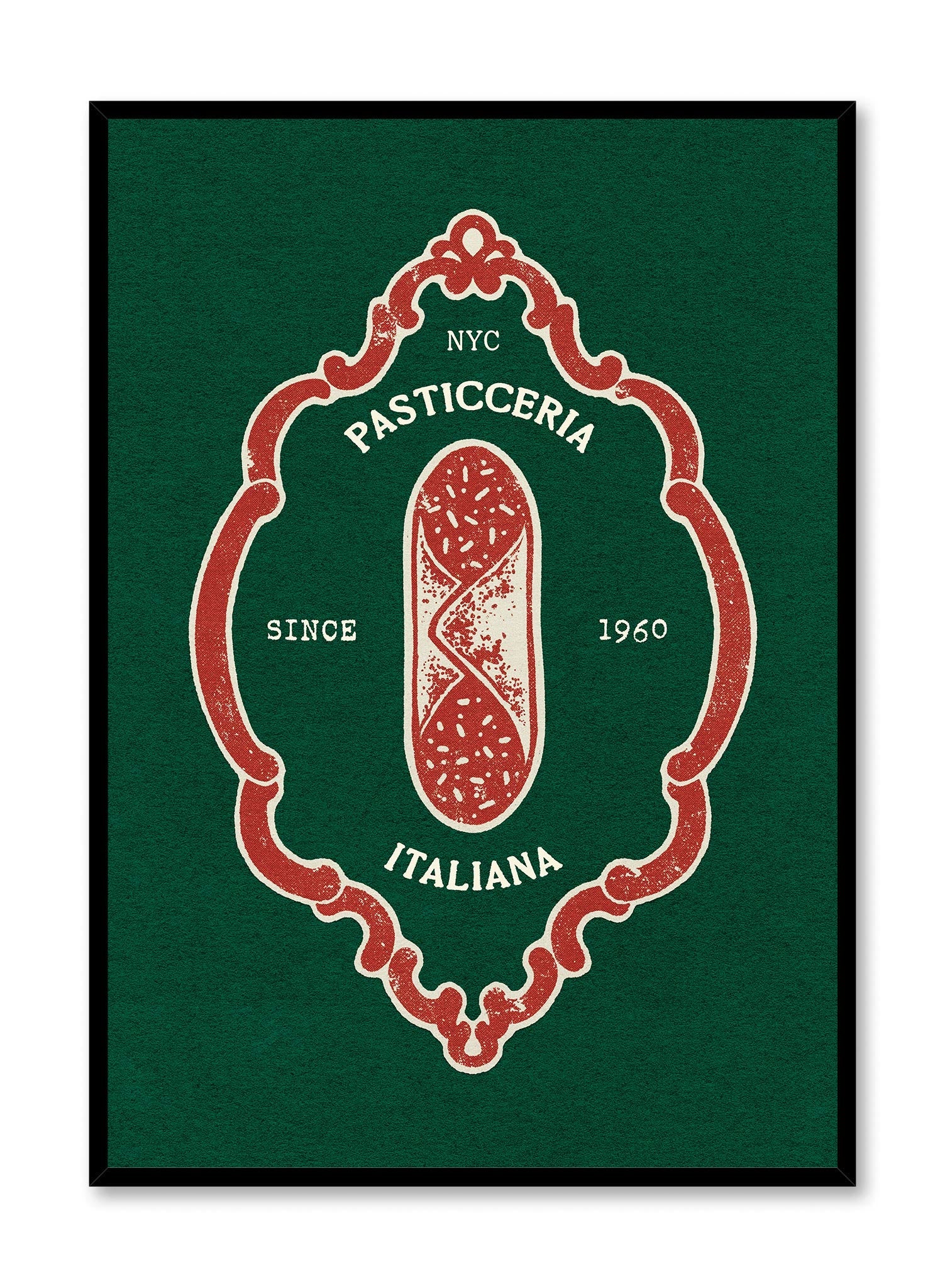 This art print is designed as a vintage emblem for a New York 'Pasticceria Italiana,' or Italian pastry shop. A beautifully detailed illustration of a cannoli sits at the center of an ornate, rococo-style frame. The text, including the proud establishment date of 'Since 1960,' adds to the authentic, old-world feel of the piece.
