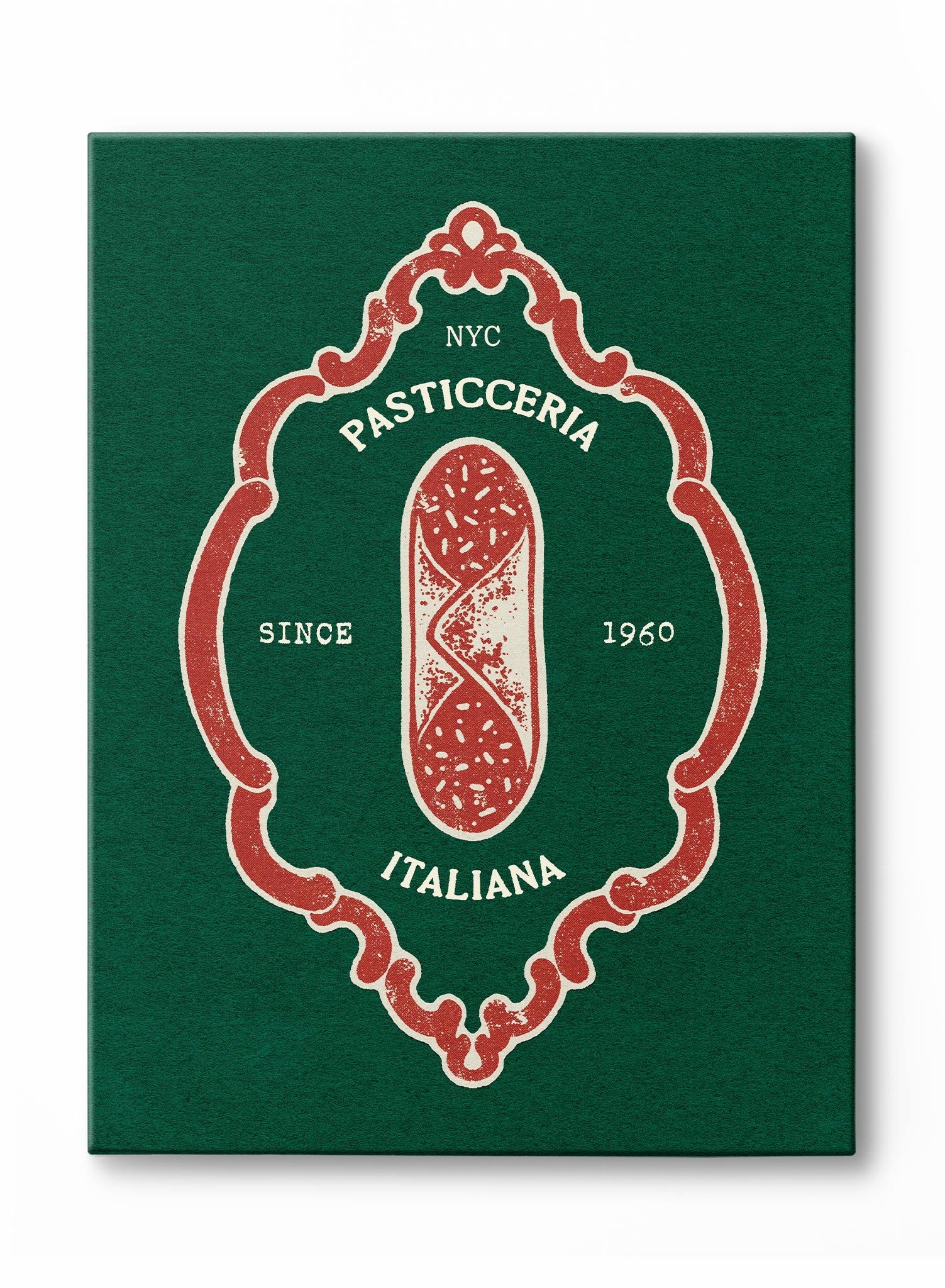 A rich and elegant color palette of deep forest green and rustic red gives the print a classic, sophisticated look. The textured background and slightly distressed lettering evoke the feeling of a timeless, painted sign on a historic storefront. It’s a tasteful and nostalgic homage to the art of Italian baking.