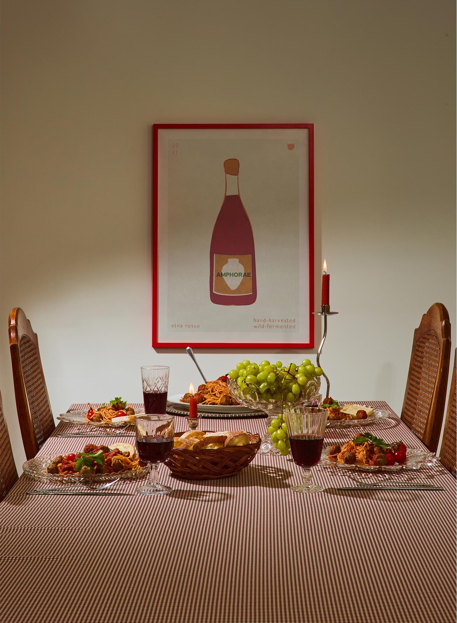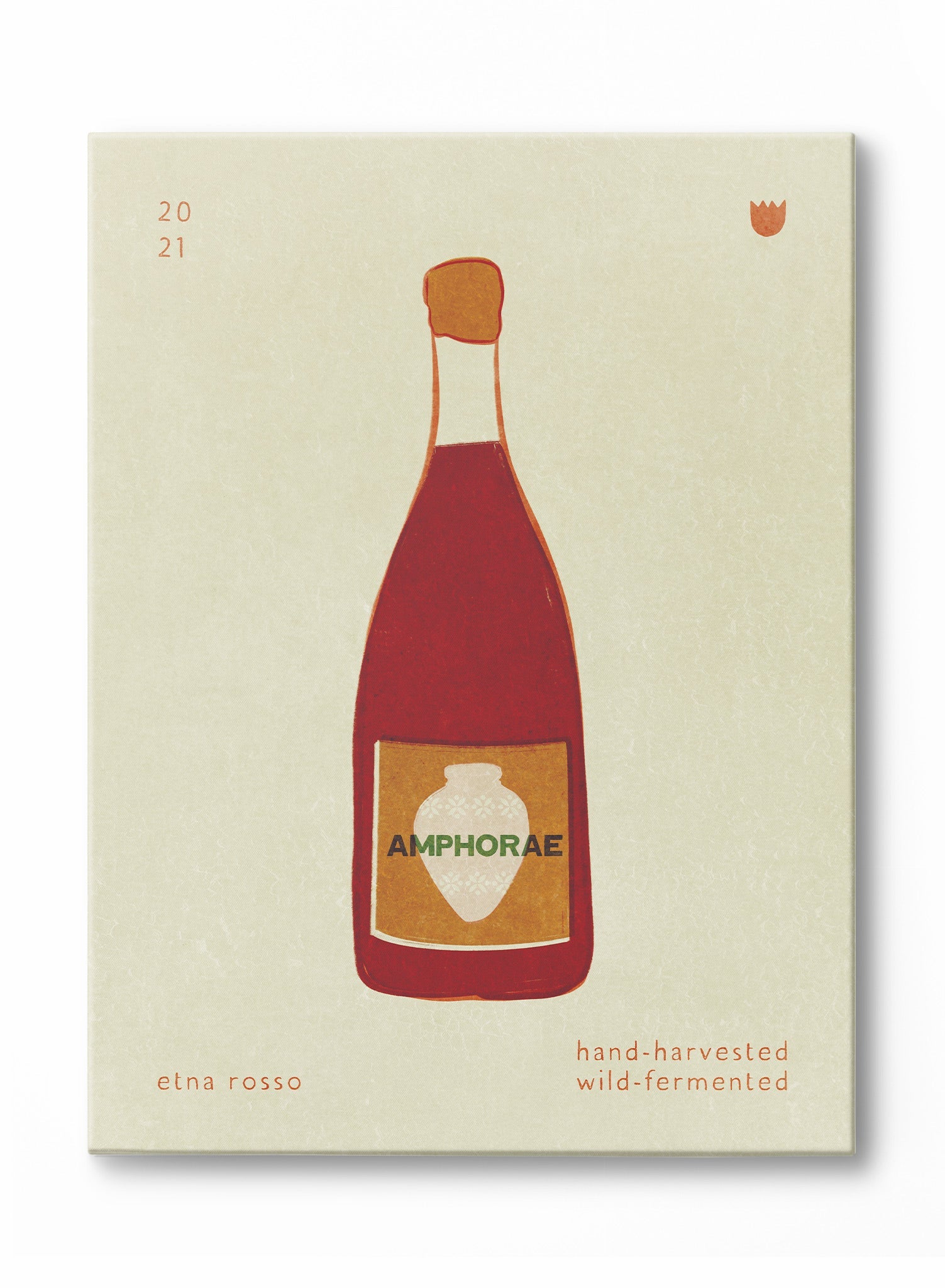 This art print pays homage to ancient winemaking traditions with a modern, graphic sensibility. It features an illustrated bottle of 'Etna Rosso,' its label distinguished by a drawing of an amphora, the clay vessel used for fermenting and aging wine for millennia. Details like 'hand-harvested' and 'wild-fermented' highlight the artisanal nature of the wine.