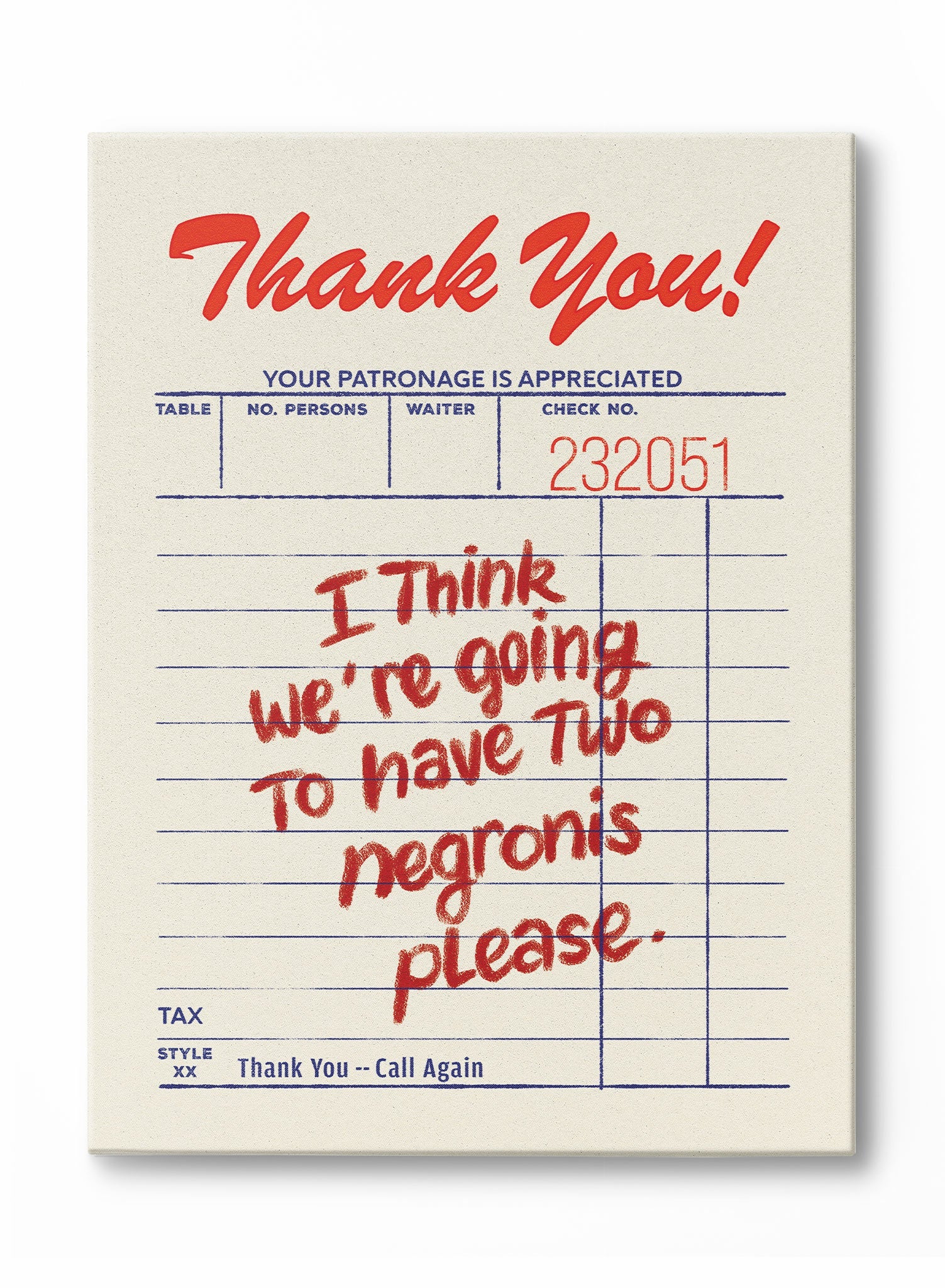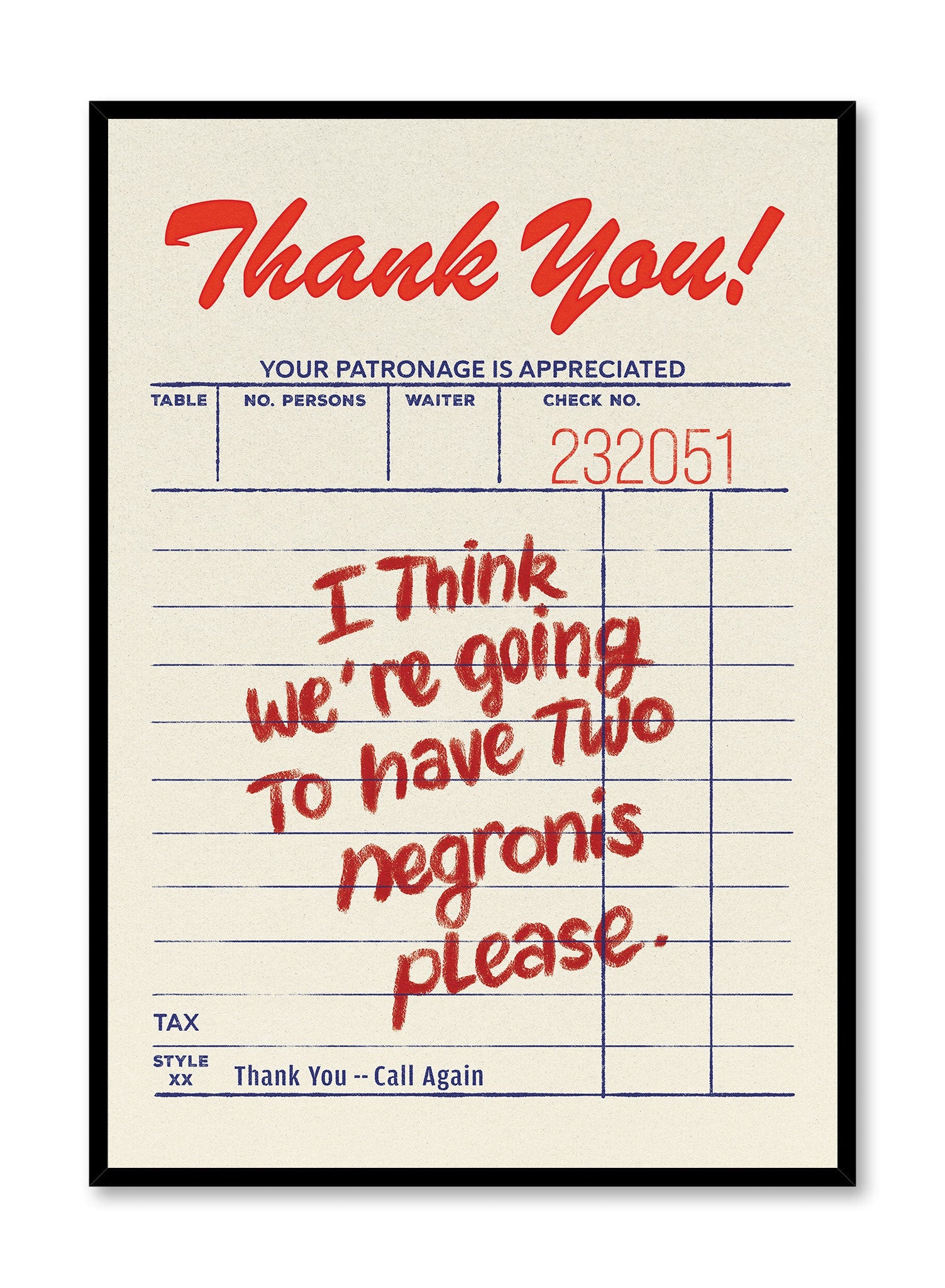 This art print cleverly captures a moment of decision at a restaurant, designed to look like a classic guest check. At the top, a cheerful 'Thank You!' is printed in a red script, while below, a handwritten order reads, 'I Think we're going To have Two negroni's please.' This piece celebrates the delicious anticipation of the first cocktail of the evening.