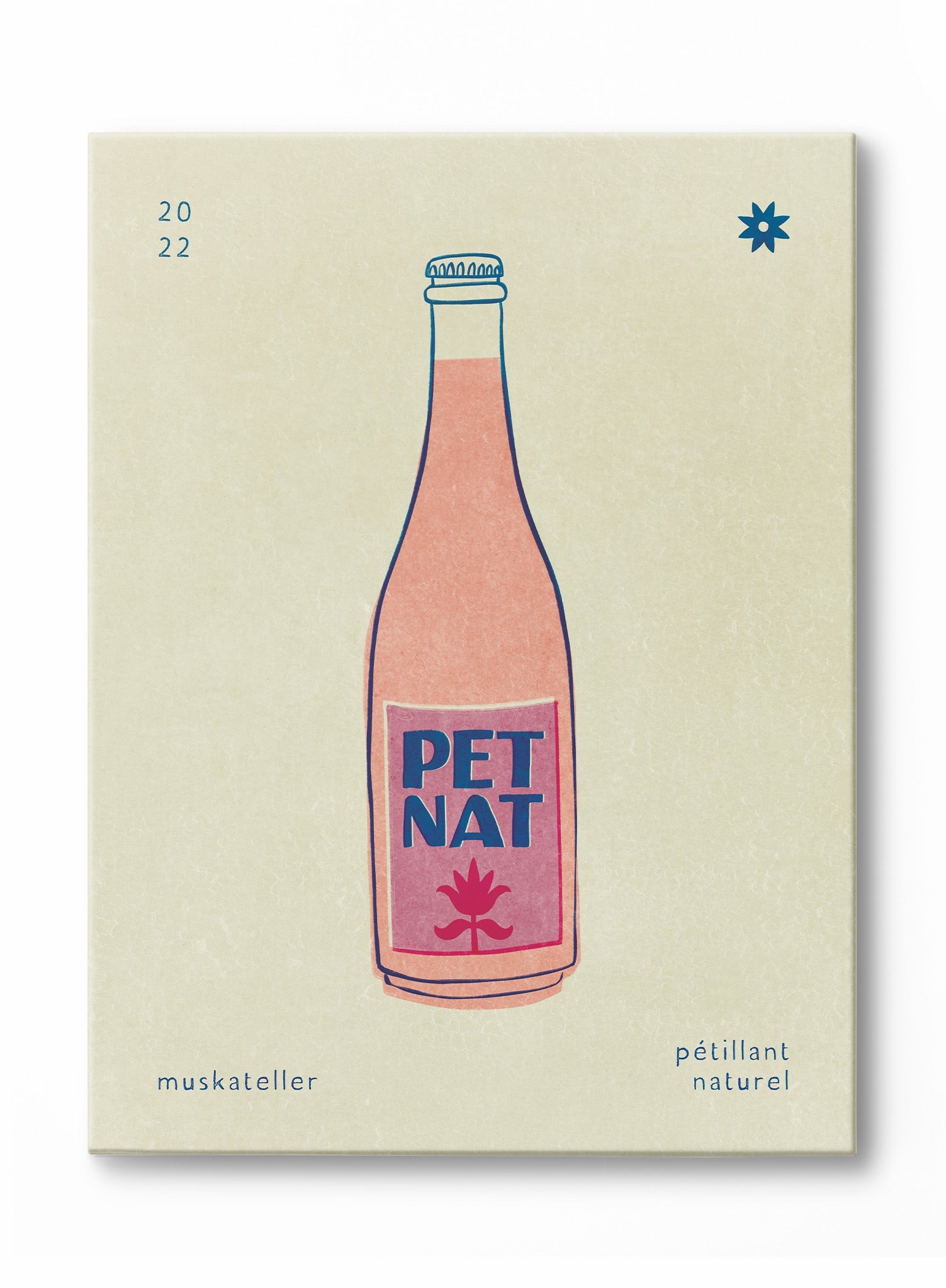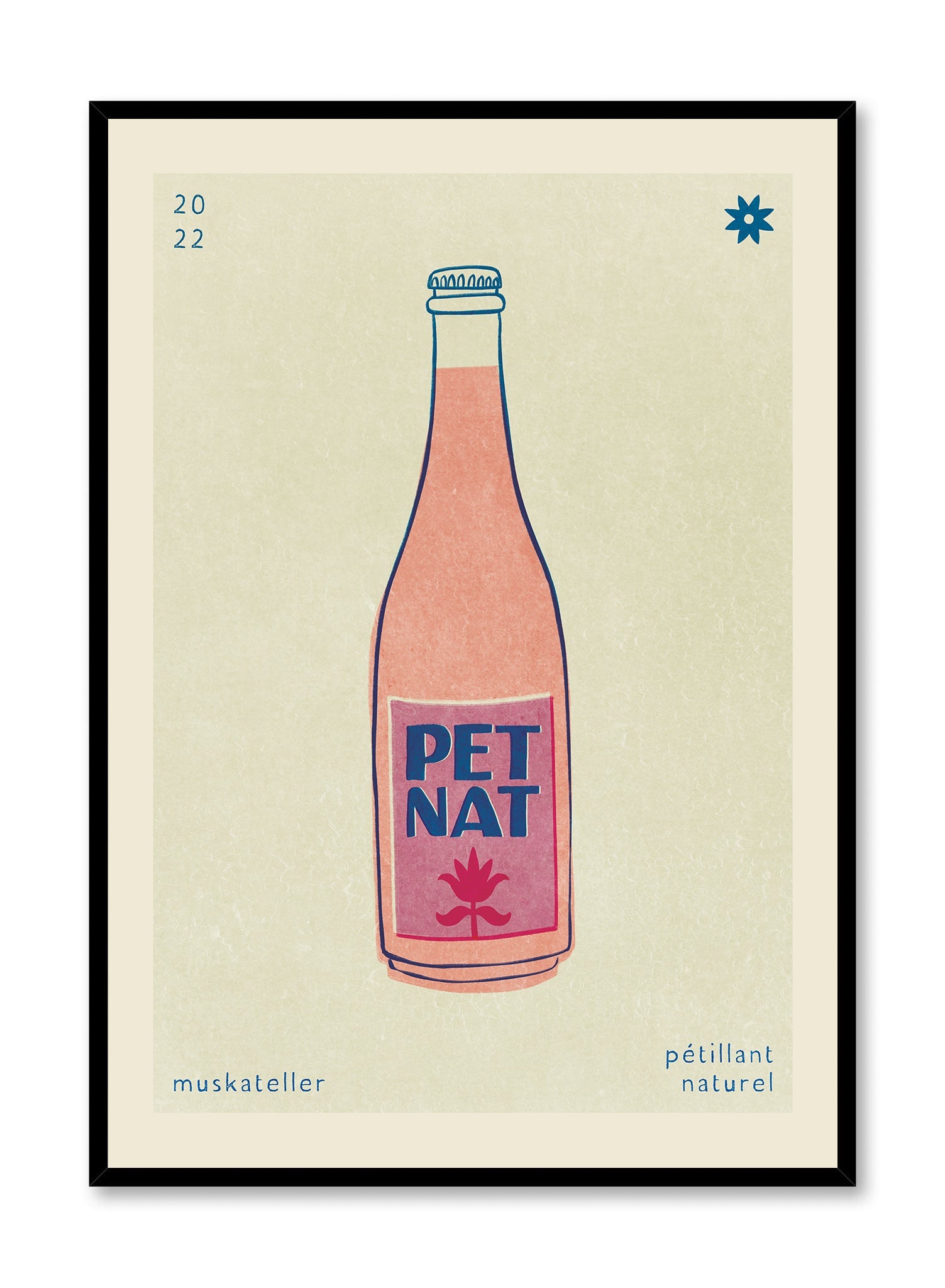 This graphic art print is a playful ode to Pét-Nat, featuring a stylized illustration of a sparkling wine bottle. The design incorporates clean lines, simple typography, and charming motifs like a small star and a floral icon on the label. Dated '2022,' it captures a modern yet nostalgic aesthetic, celebrating the ritual of opening a special bottle.