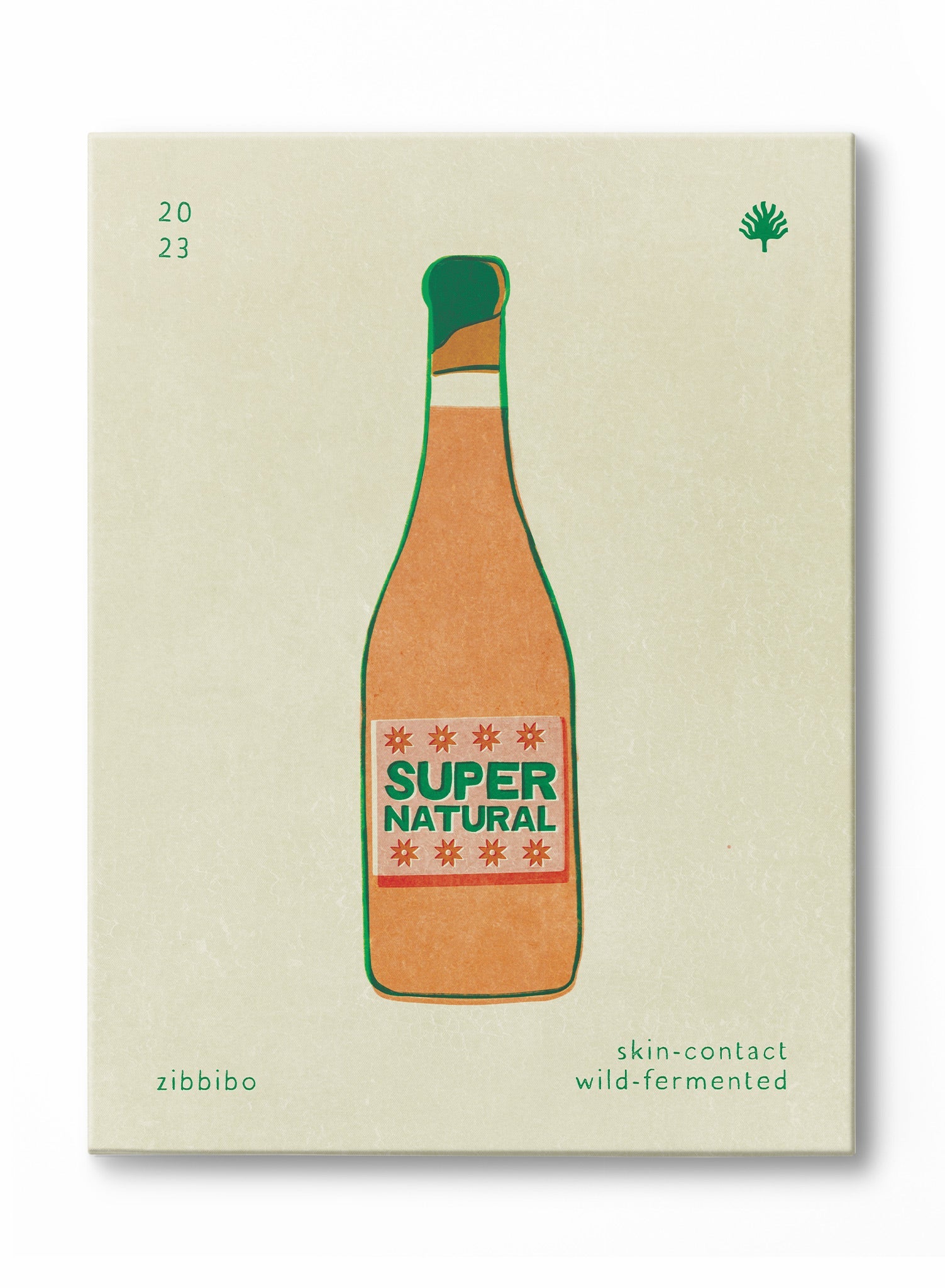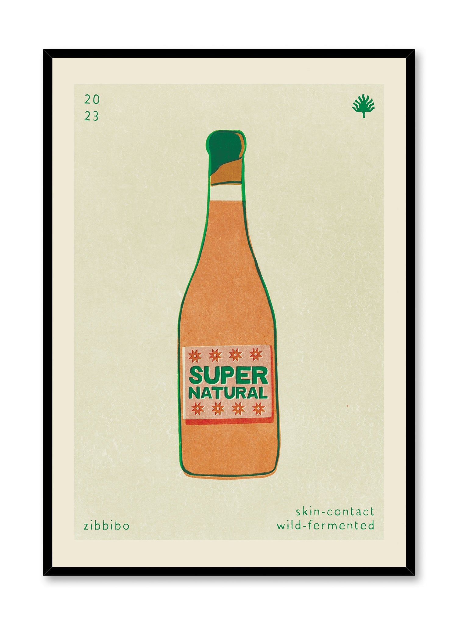 This graphic art print is a stylish nod to the world of natural wine. An illustrated bottle of orange wine is labeled 'Super Natural,' with details identifying it as 'Zibbibo,' 'skin-contact,' and 'wild-fermented.' The design is both educational and artful, celebrating a modern approach to winemaking with a playful, retro aesthetic.